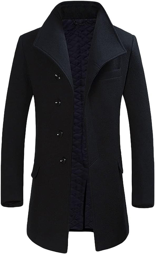 Mens Winter Wool Trench Coat Mid Length Slim Fit Casual Stand Collar Overcoat