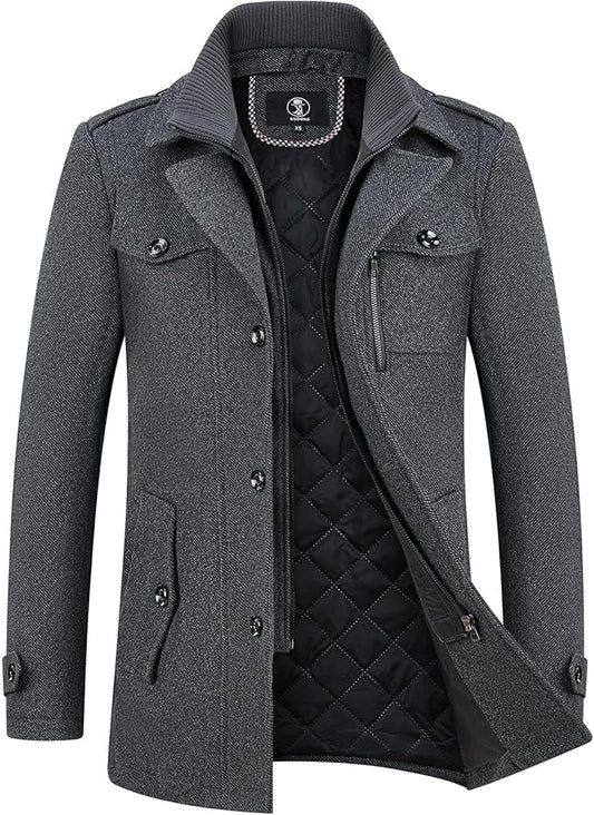 Mens Wool Coats Winter Padded Trench Coat for Casual Business Outwear Thick Wool Blend Peacoat with Removable Inner Collar